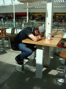 Saturday Jeff + I were still in Calgary. We were going to shop for his wedding outfit if you recall. Jeff was EXHAUSTED!!!!!!! Working 16 + hours a day, commuting an hour to work, + taking care of multiple cast + stunts on a dirty western show is finally taking it’s toll on the poor man. So when we arrived at the mall, it was like me walking around with a hulking zombie slowly trailing behind me by 2 feet. After we ate lunch, I came out of the bathroom + found this: