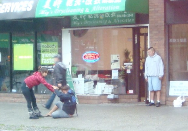 After picking up the car + on the way back home to North Vancouver, we were driving through what Jeff + I call Cracky McJacky Town. Very unsavory, but I could still eat Canada’s crack addicts for breakfast when comparing them with Los Angeles crack addicts!!! But look at what we saw!!!