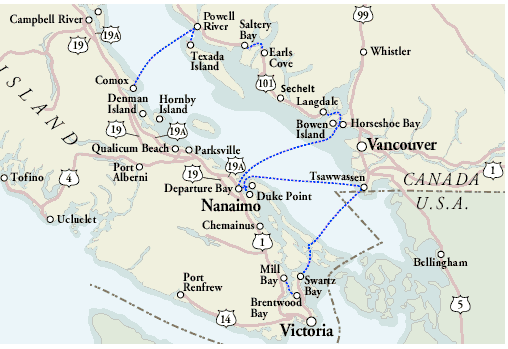 First, is the hour long BC Ferry trip from Horseshoe Bay to Langdale. Then, it is an hour long drive up the Sunshine Coast to where Steve + Liz’s boat dock is.