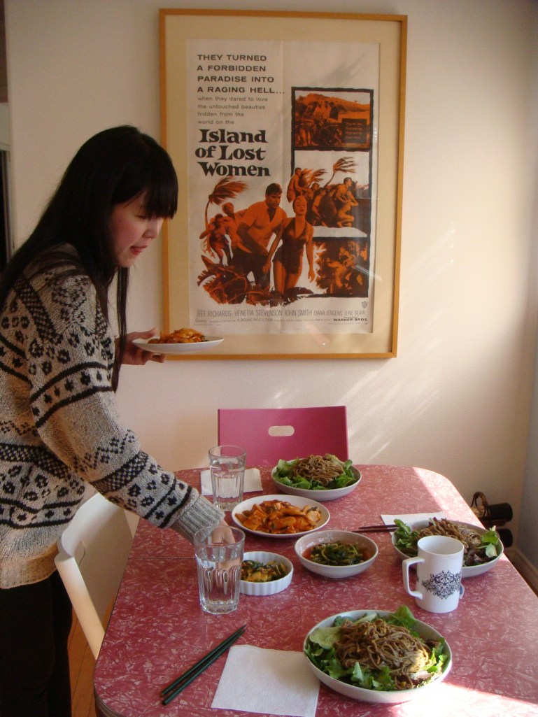 For all of you that think Korean food is all bulgogi + meat – you’re wrong!!!!! Naomi uses lots of greens + everything tastes so light!!!! Lunch was buckwheat noodles on a bed of spring greens, cucumber kimchi, daikon leaf kimchi + spicy rice cake. YUUUUUUUUUUM!!!!!!! Thanks Naomi! My compliments to the chef!!!!