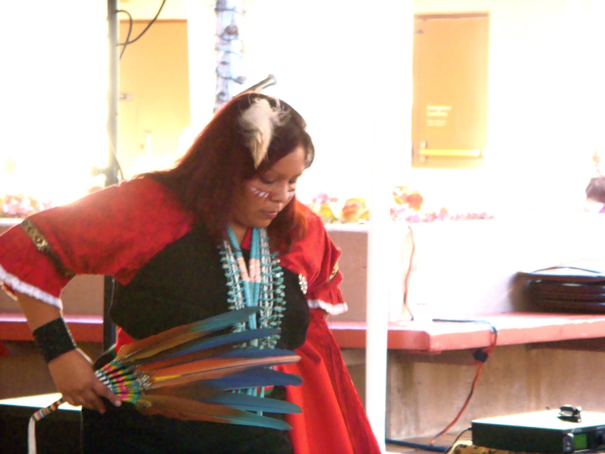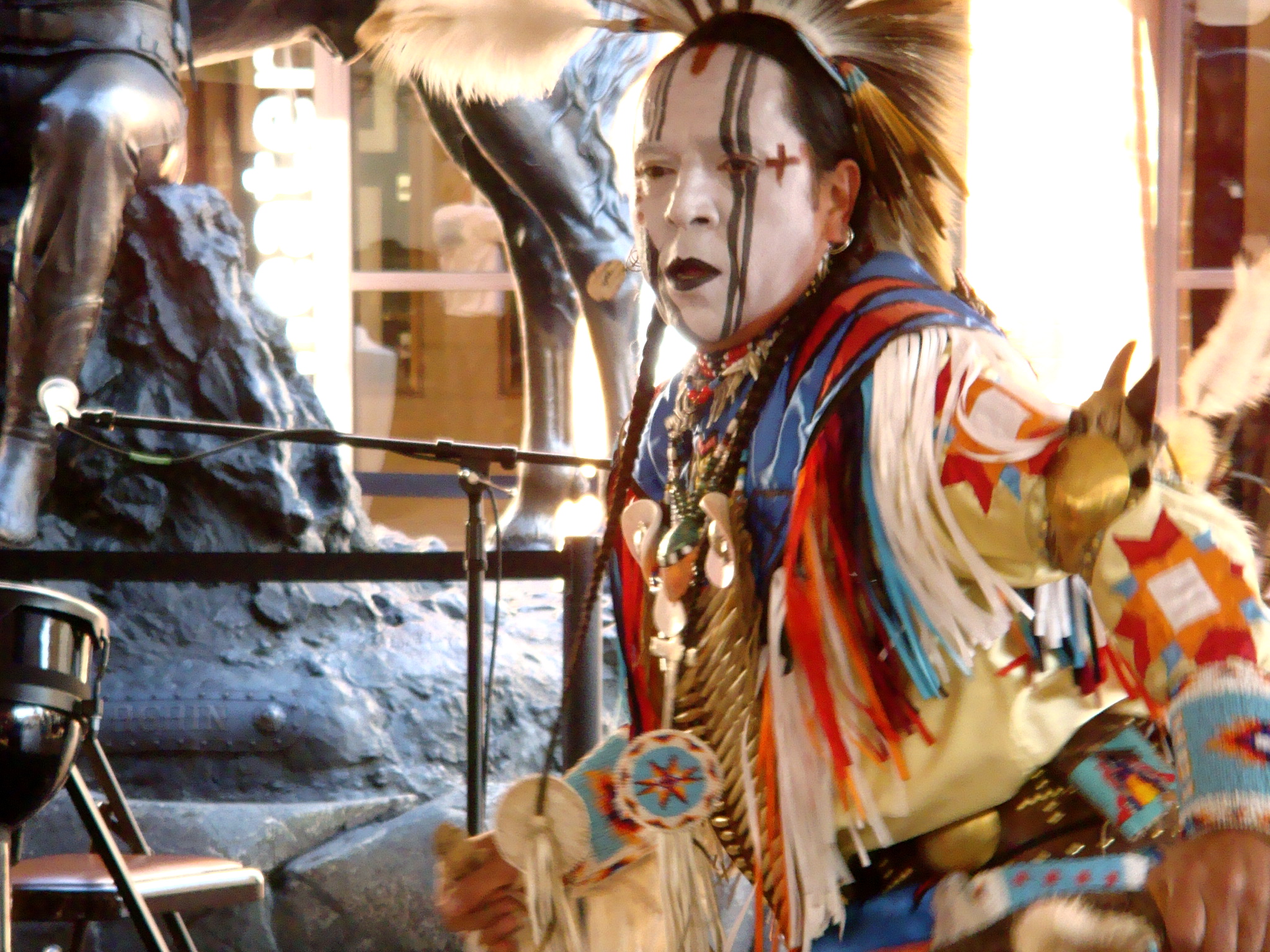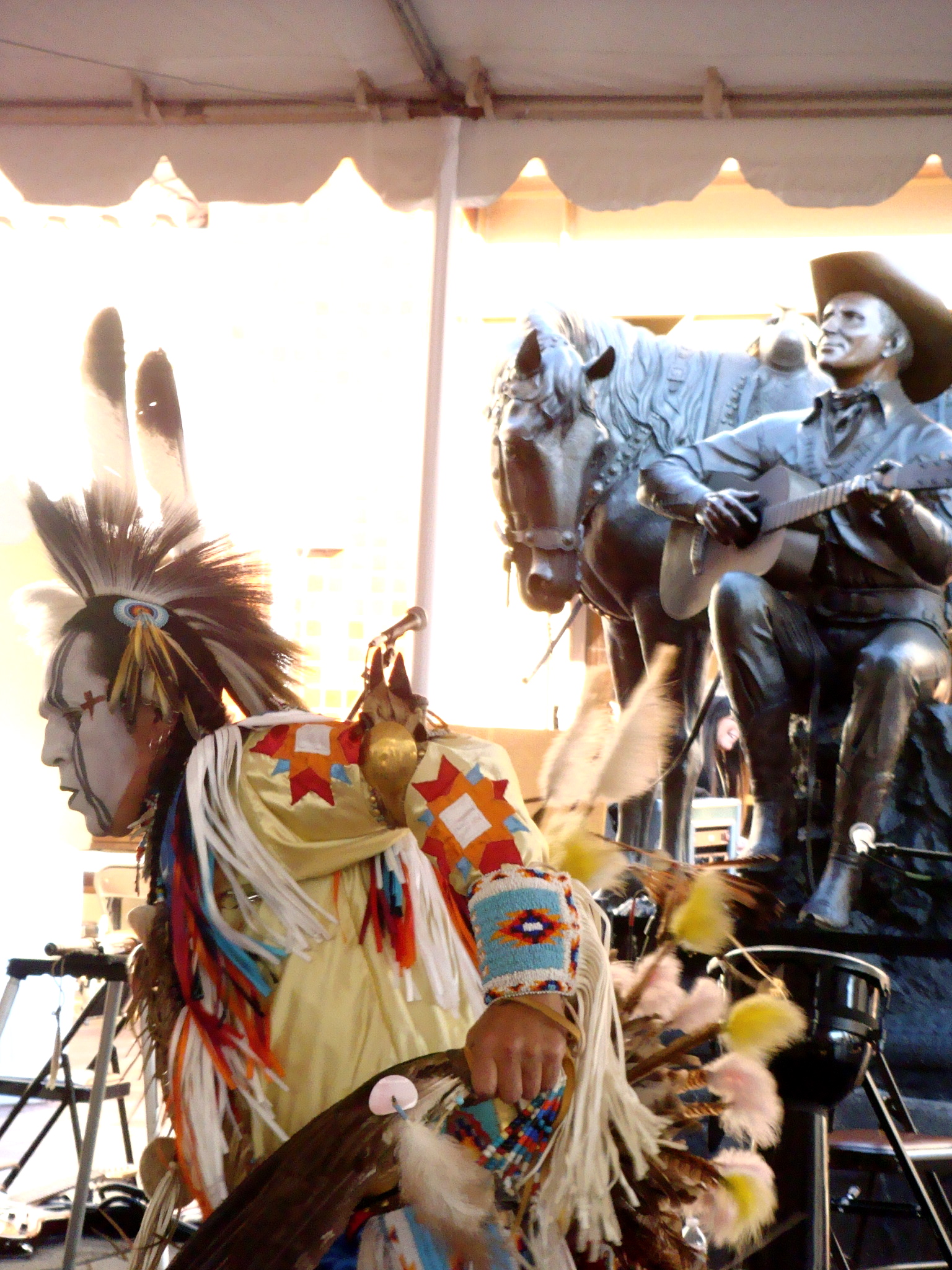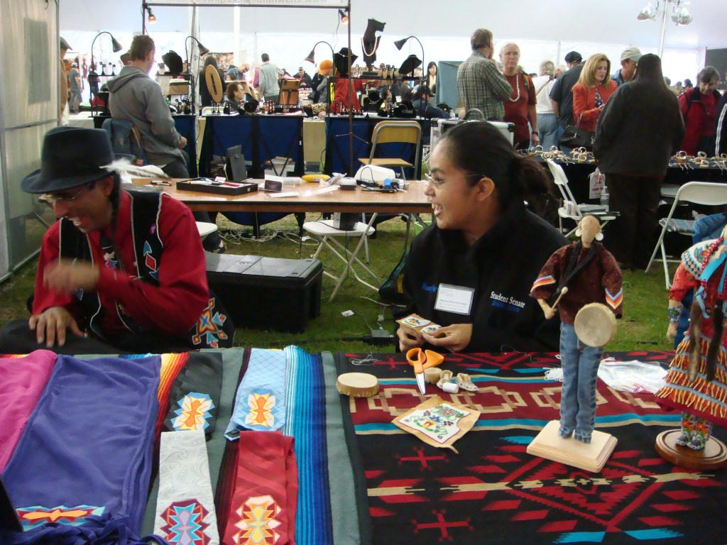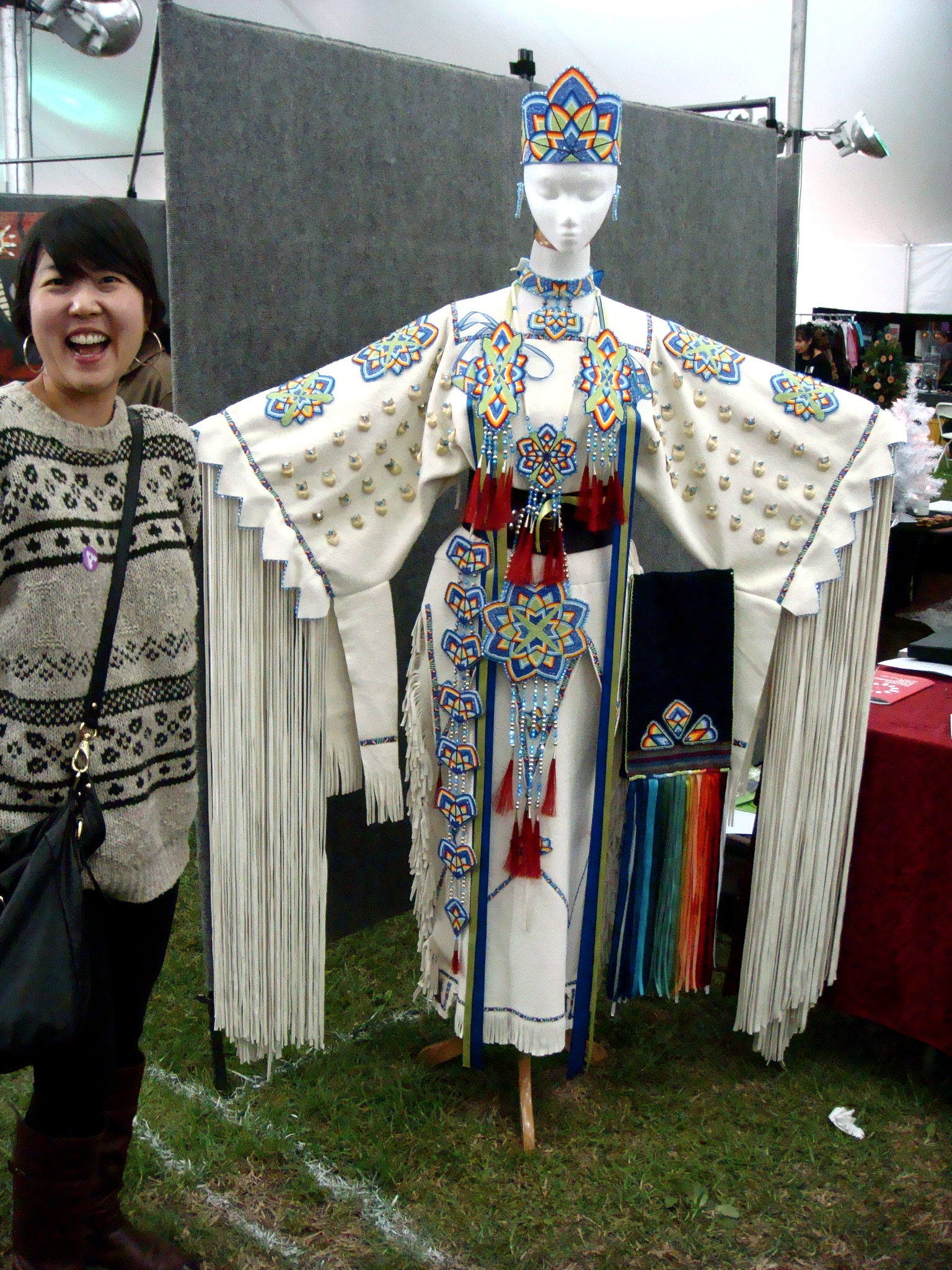 Inside the tent there are vendors selling everything from turquoise, art, photography, clothing, etc. Here’s Debbie in front of a beautiful beaded pow wow costume.