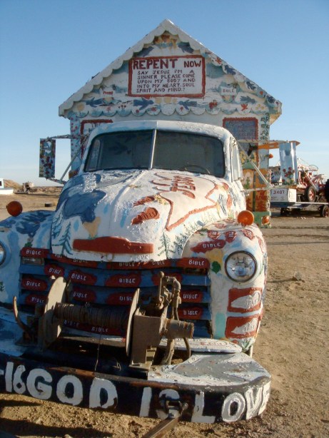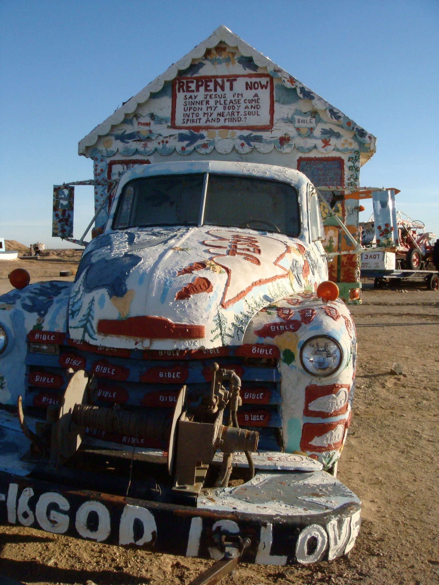 Leonard Knight unfortunately has succumbed to dementia + alzheimer disease + has been taken to a full-time care facility. I would have loved to have met him, as he used to live in one of his painted trucks below Salvation Mountain. He had many plans for Salvation Mountain, + will never be able to see them finished. But, Salvation Mountain has been entered into the Congressional Record in 2002 as a National Treasure + the land belongs to Leonard Knight! Leonard Knight’s dream + labor of love will be maintained + enjoyed by people for I hope a long, long time. Please visit!!! I plan on going to the mountain again to spend more time there.