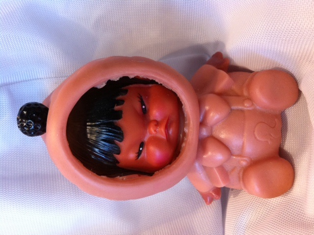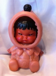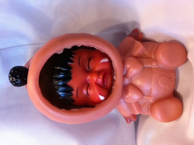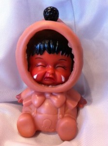 Jeff found this doll in the midst of lots + lots + lots of stuff. He calls it the “Shelli Mood Meter”. It has three different faces when you twist the bon bon on the top of her hood. He took it down to the kitchen + told my parents to check the baby’s face, so they’ll know if they have to tread lightly around me. They all laughed very loud + hearty. They were quite enjoying themselves at my expense. Real nice, guys.