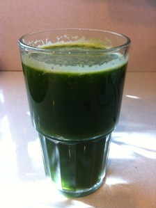 You have to buy ALOT of deez veggies. I mean BAGS of them. I can go through an entire bag of spinach + the result will be a 1/4 cup of juice. Buy LOTS of ORGANIC veggies + PRE-WASH + PRE-CUT them!!!! I’M USING LOTS OF CAPITAL LETTERS BECAUSE I’M TRYING TO SOUND ENTHUSIASTIC BECAUSE I FEEL LIKE ALL I WANT TO DO IS LIE DOWN RIGHT NOW. Yes, pre-cut + pre-wash the veglettes because throughout the day you won’t have enough energy to do it + then you’ll want to squash the whole project. I swear. Here is my beautiful juice.