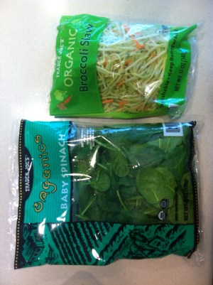 Here are my juicing ingredients. Spinach (or any other dark leafy green like kale) + broccoli stems (if I’m lazy, broccoli slaw from Trader Joe’s).