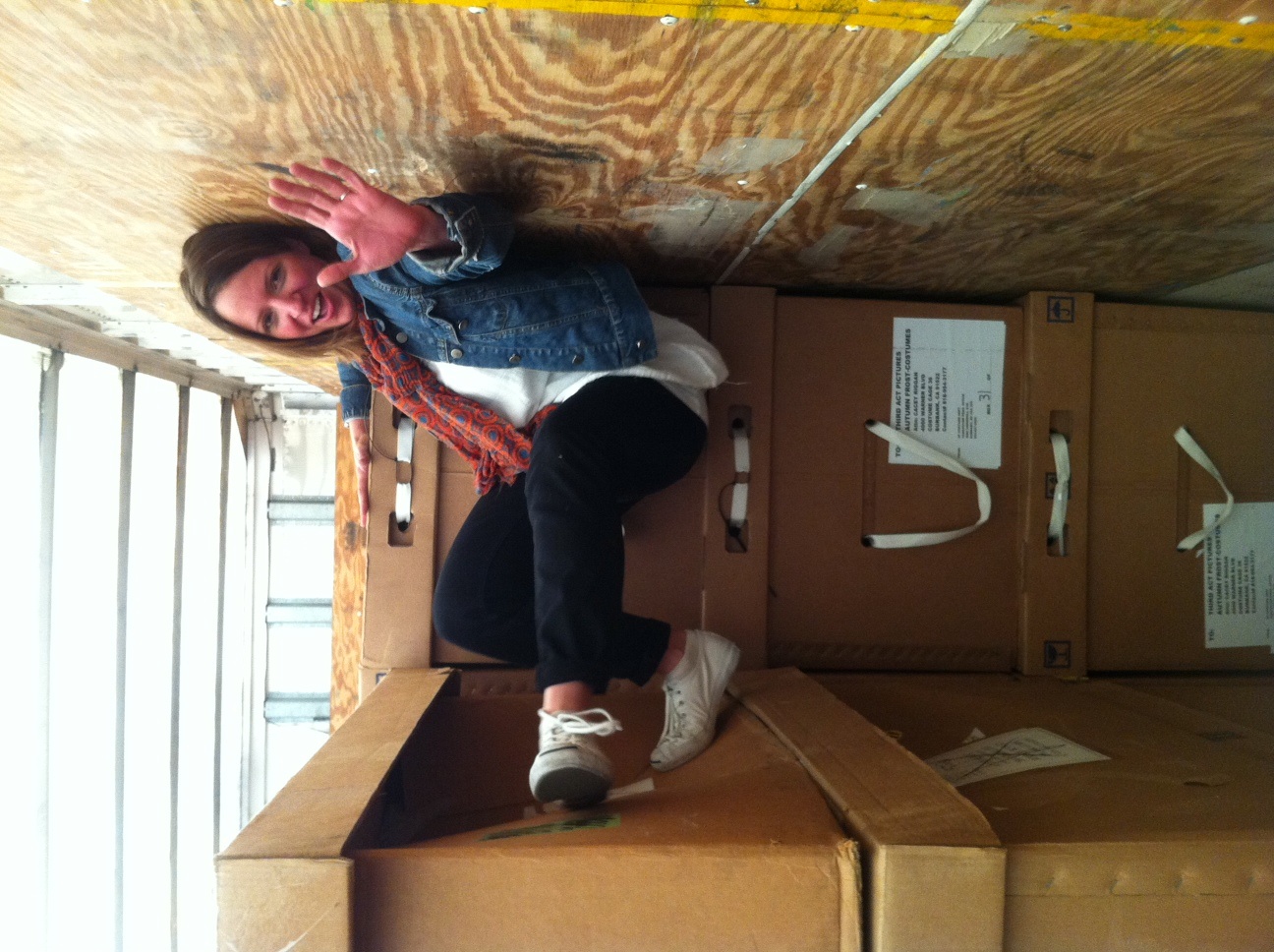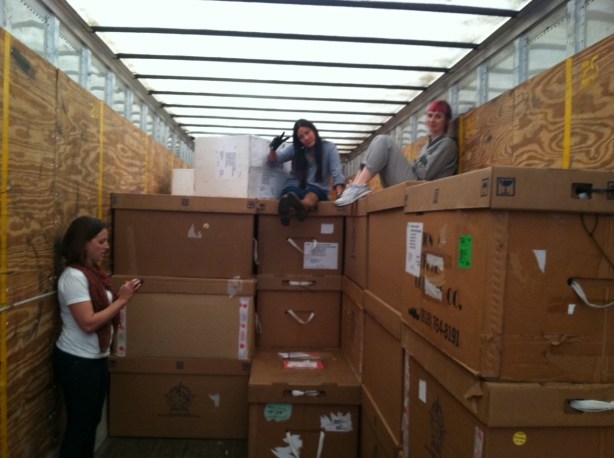 This is spine snapping work everyone. Here we are taking a break + chilling atop the towers of boxes, probably discussing the dreamy John Hamm.