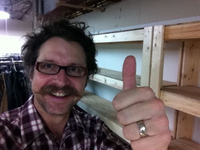 Haha! Look at his crazy mad scientist hair! He’s so cute! Why the thumbs up? Behind him in the costume department is shelving that he drafted up, + the construction department built.