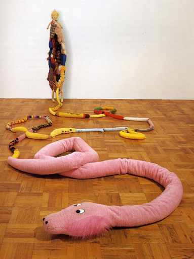 Earlier this year, Mike Kelley committed suicide following a serious depression. When I heard the shocking news on the radio, memories immediately flooded my head + I became so heartsick. Mike Kelley’s artwork went up against religion, education, childhood + sexuality. His aesthetic has been called repulsive, creepy + ugly. I thought it was really punk rock.