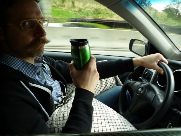 Jeff said the past couple nights I was grinding my teeth in my sleep.  That means I’m stressed!  I’m happy to finally be packed up + on the road, that’s for sure.  Here’s Jeff in his drive-to-Alberta mode.  He surrounds himself with pillows when he drives because it’s comfy.  Isn’t that just precious + weird?!