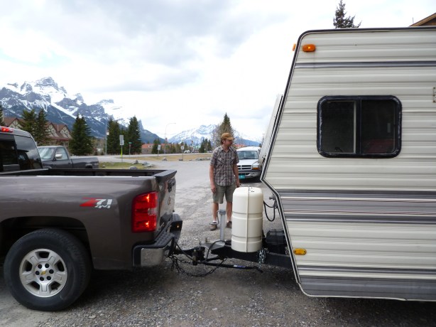On the road. The old lady is heavy, which made it hard for Mike’s truck to tow it in the wind.