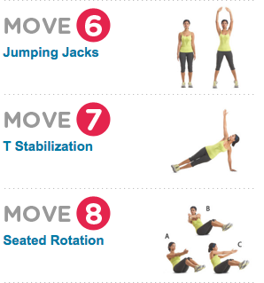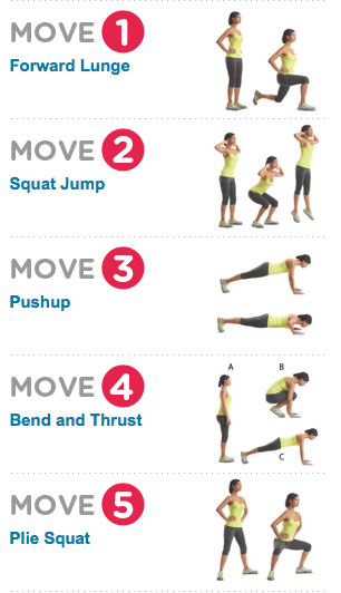 This set of pylometric exercises are from the Women’s Health Magazine’s “Work Out at Home”. Ch-ch-ch-check it out!!!! Perform each move as many times as you can for 60 seconds with no rest between each move. After you complete moves 1-8, rest for a minute + then repeat the whole shebang 1 or 2 more times if your heart so desires. Do this 3 times a week. It’ll kick your butt. When I first got back into it again, I almost vomited.