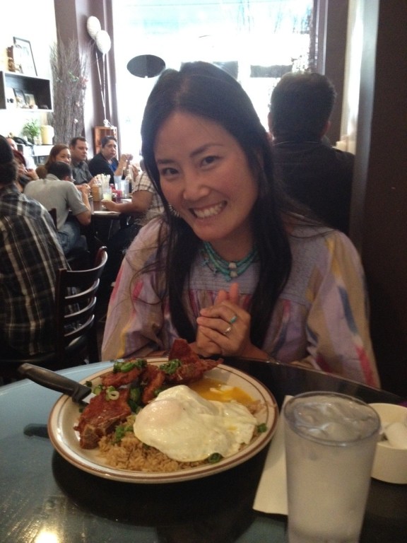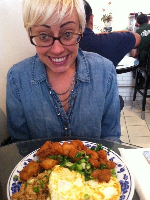 I got their famous spicy pork chops.  Both our dishes came with fried rice, eggs + generous heapings of sliced jalapeno + green onions.  Doesn’t it look like I’m praying to my dish?  That’s because I practically was.