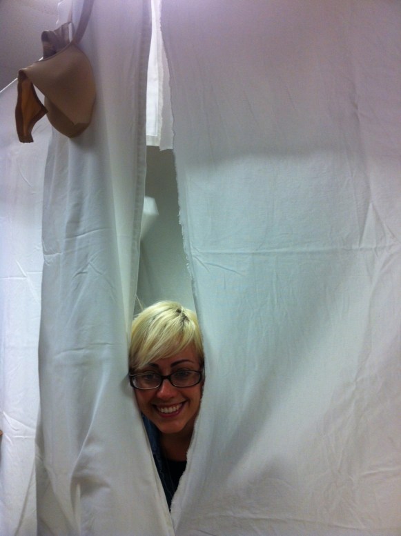 Here’s my buddy Sarah peeking out from the fitting room curtains: