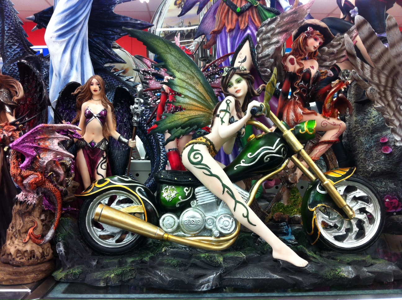 Sexy-tattooed-biker fairies, anyone?  I mean, what the heck!  Sarah + I were freaking out + pulling our hair out, whilst jumping up + down in our disbelief.  They also had a Sexy Brandon Lee “The Crow” fairy but I was so confused about the entirety of them that I forgot to take a picture.  Just imagine this: