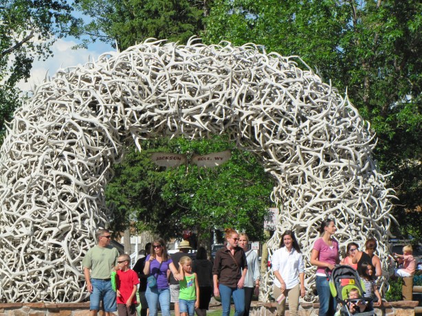 After Utah, we drove past hours + hours + hours + hours of farmland. Whizzed by Jackson Hole, Wyoming. And I mean flew through because Jackson Hole is crazy congested, chock full of tourists + rhinestone cowboys. This is all y’all are gonna get of Jackson Hole – their famous antler archway: