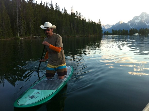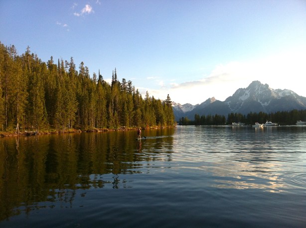 Since we arrived in late afternoon, we hurriedly (that’s the only way we do things – hurriedly + frantically) took my new stand-up paddle board (Oh? You didn’t know I bought a paddle board in Los Angeles??? Well, I DID!!!!) out on Jackson Lake for it’s virgin voyage.