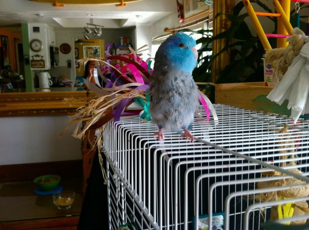 Our Parrotlet, Blue.  If only I could stay + train him.  He’s so smart!!!  And fluffy – I could just squeeze his little eyeballs out!!!