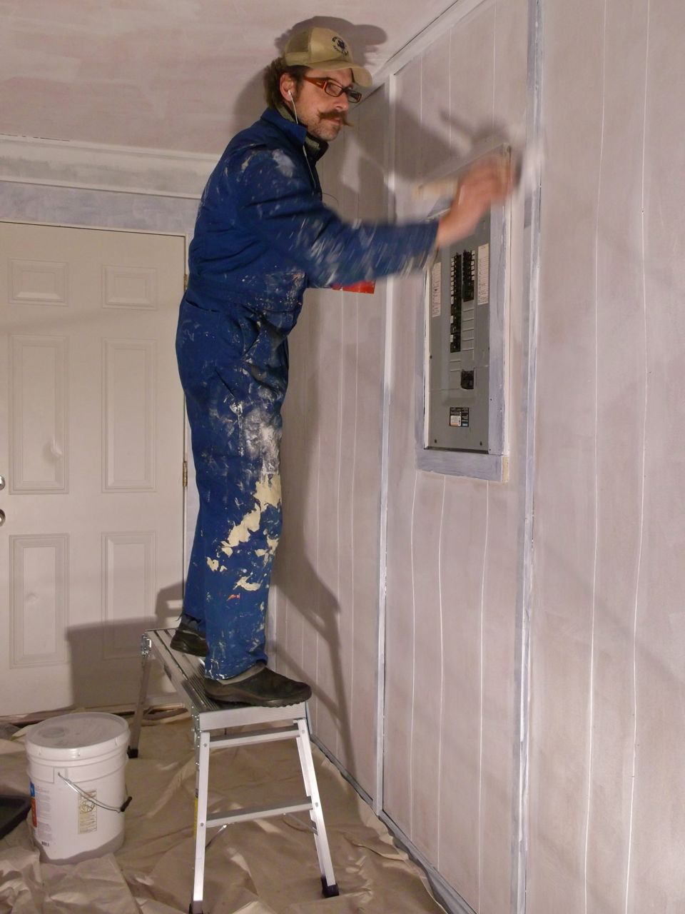The house is such a crazy, upside down mess – it’s totally driving me up the wall.  There’s stuff piled wherever there’s a space + seeing all the disorganization makes my skin crawl!!!  I NEED ORDER!!!!  I CAN’T LIVE LIKE THIS!!!!  Jeff is trying to distract me in the background with a little painting intermission by playing some air guitar.  Nice one, Jeff.