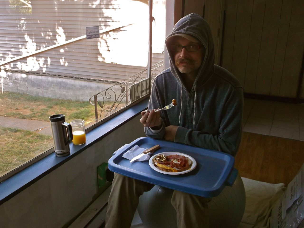 Nope, it’s YOU, buddy!!!  Breakfast with a Rubbermaid bin serving as a tray whilst sitting atop an exercise ball for a chair.