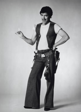Moustache + all.  Check out those sweet bell bottom jeans.