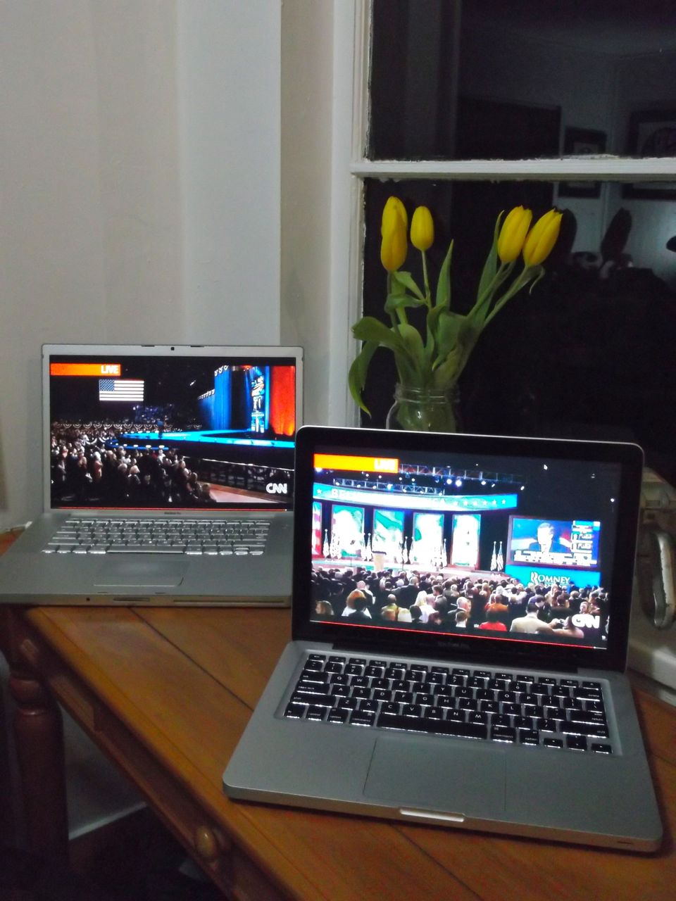 Jeff + I were biting our nails. Since we don’t have a television, we set up one laptop broadcasting live feed from the Romney headquarters, + the other displaying the Obama headquarters.