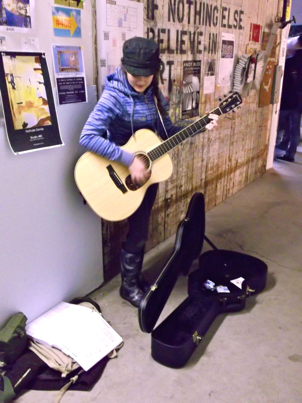 But what really warmed my heart that day was to see this little girl “busking” (What Canucks call street performer.  Weird, eh?!) in the hallways.  She was singing + playing her guitar with all her might + I loved her for it.  Oh, + her mom was right by her side, supporting her.  Awwwwwww.
