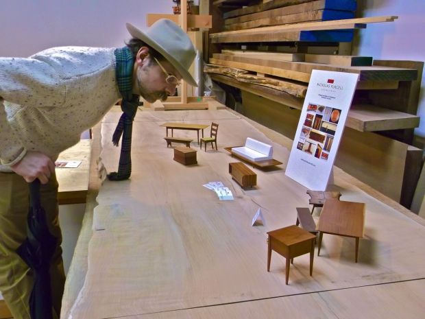 In the same space, Nicholas Purcell another wood worker had some exquisite pieces on display.  Go visit his website.  His furniture is craftsmanship at it’s finest.  He also makes absolutely perfect miniatures for his wife that Jeff + I were drooling over.