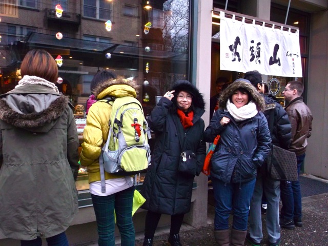 When we arrived at Santouka, there was a pretty long line up. Yick. Wait, who are these mysterious hooded figures drooling at the Japanese plastic food displayed in the window? Lost Hobbits????