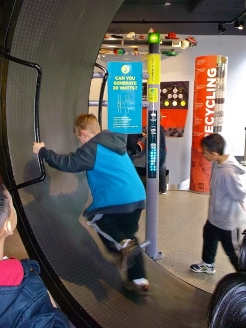 The magic of Science World lies in all of their amazing interactive educational tools that make learning totally radical!  Our first stop was the “Our World” gallery, which teaches kids about sustainability + being green!  Here’s Tobin working away on the wheel – running to create watts of energy!  Look at the little guy to the right in the grey hoodie, checking out Tobin’s wattage stats.Science World - Vancouver - 03