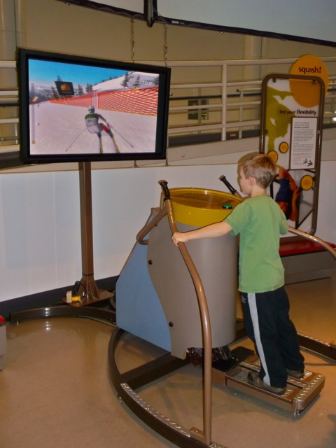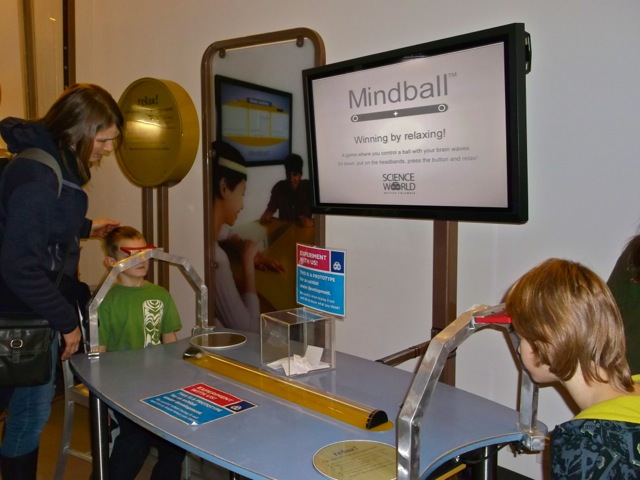 Kids loved this game!  I still don’t understand it + Deb had to explain it to me twice.  It has something to do with monitoring the brain waves + a ball moves according to the players brain patterns.Science World - Vancouver - 08