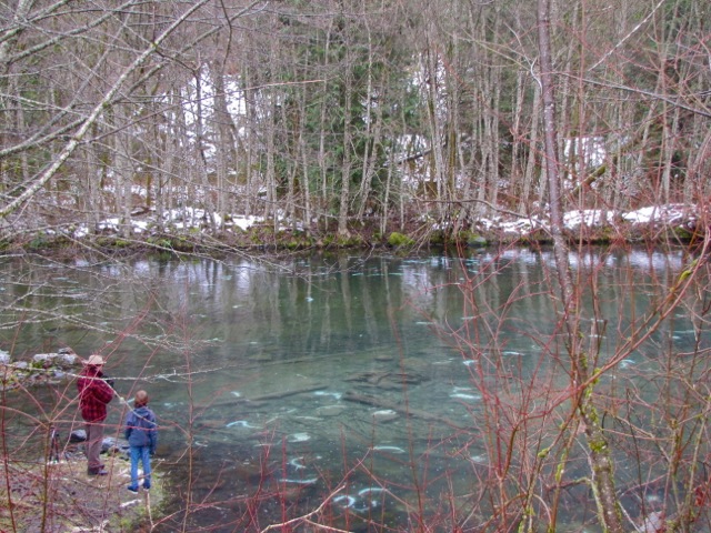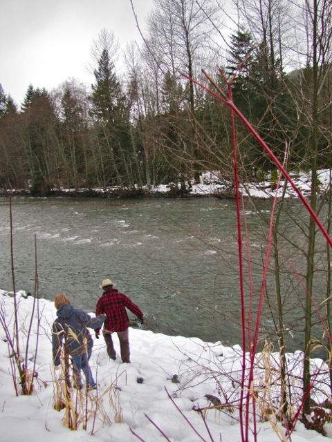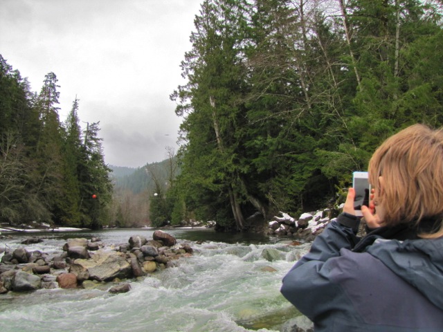 We trekked for what seemed like forever along train tracks + scrambling over + under branches – it was wet, sludgy slow going.  Finally, we reached Squamish River.  There was a couple of guys fly fishing in the river.  I’d love to learn one day.Squamish Eagles'13 - 28
