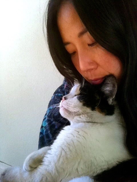 Ten years ago I found my sweet cat Megumi underneath the freeway – scraggly, starving, crying + alone. A little back story, I was under the freeway working on the set of a film. Don’t be alarmed, folks! I don’t regularly troll under freeways much. Ever since then we’ve been inseparable + she is extremely attached to me, as most rescues are.