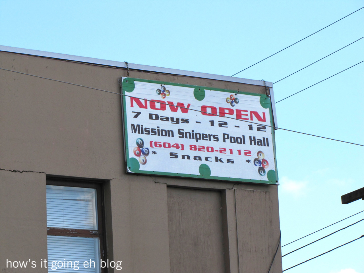 Mission Sniper Pool Hall???  What the heck is that?!  Only snipers shoot pool here?  It was Easter weekend + was closed so I couldn’t go in + confirm.  Random.Mission BC - 02