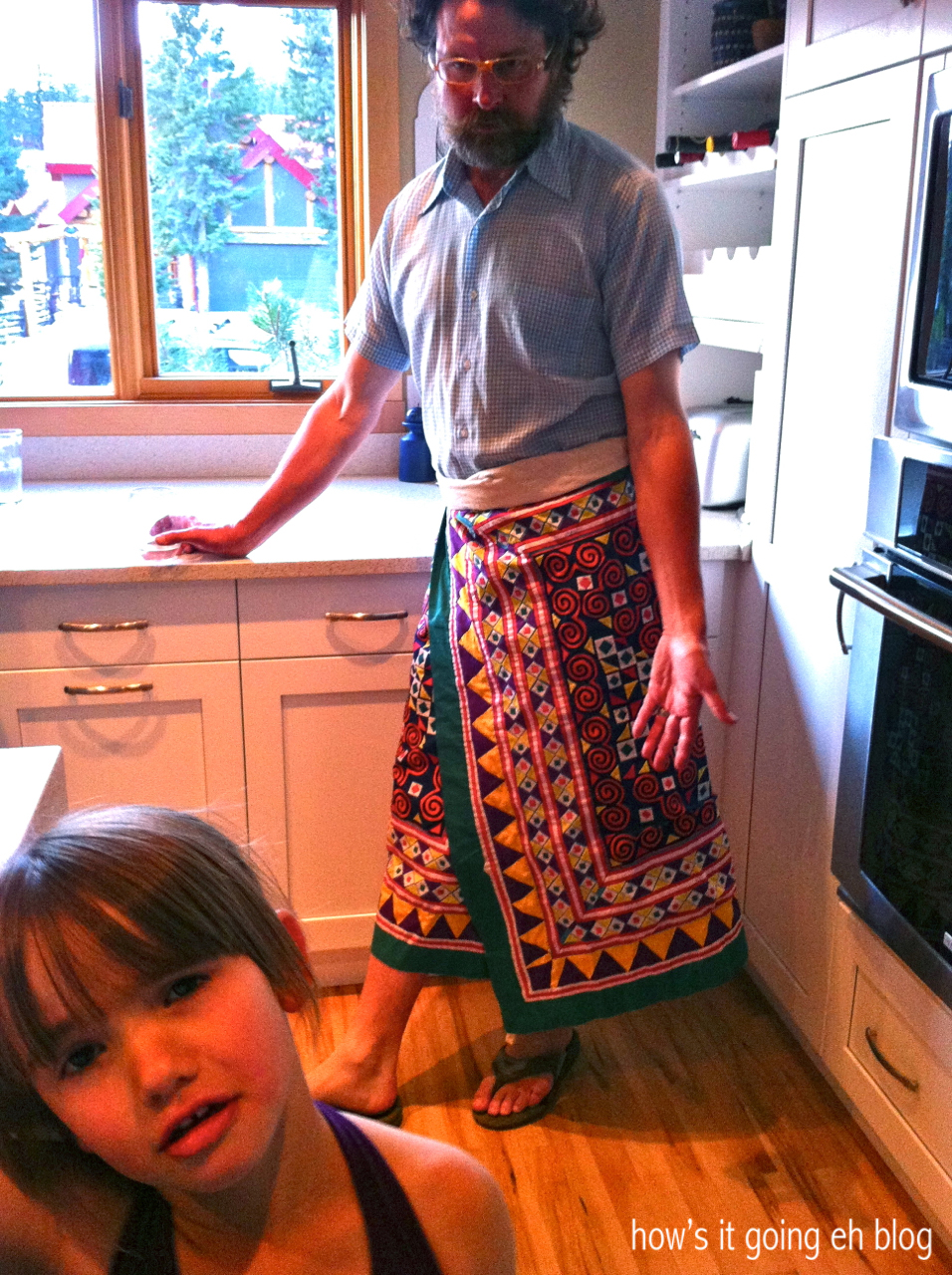 Juna was having the time of her life dressing up Jeff.  She found her mom’s gorgeous Thai quilt + decided that Jeff needed a little sprucing up.Dress Up Lobster Fest - 01