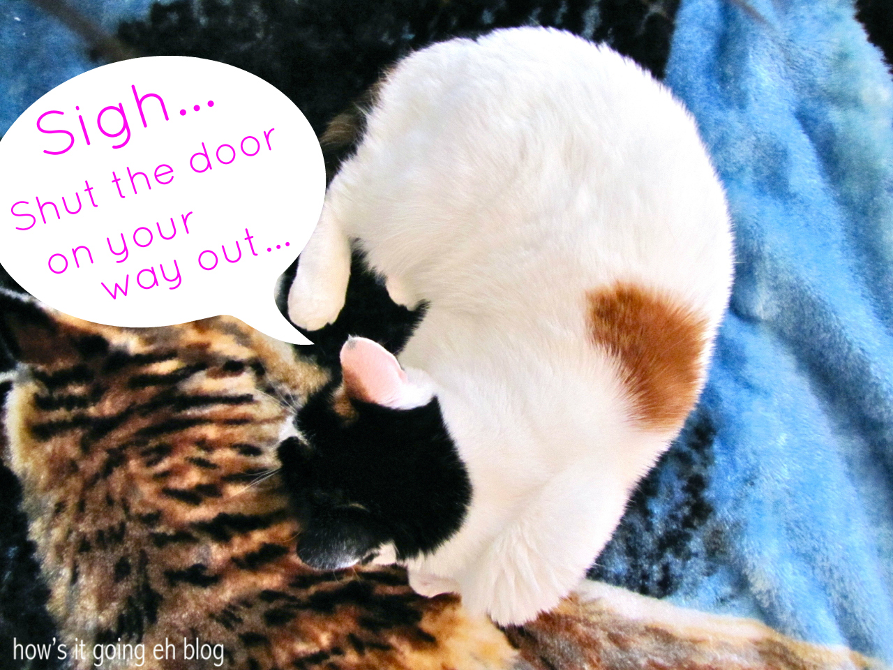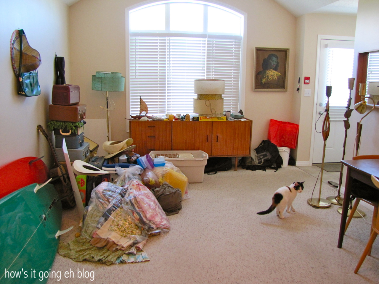Pardon for the intrusion your majesty! She puts up with the clutter, new situations + moving around really well for a wee cat! Anyway, there’s a little glimpse into our Alberta condo. Yikes….if anyone has any suggestions I am all ears!!!