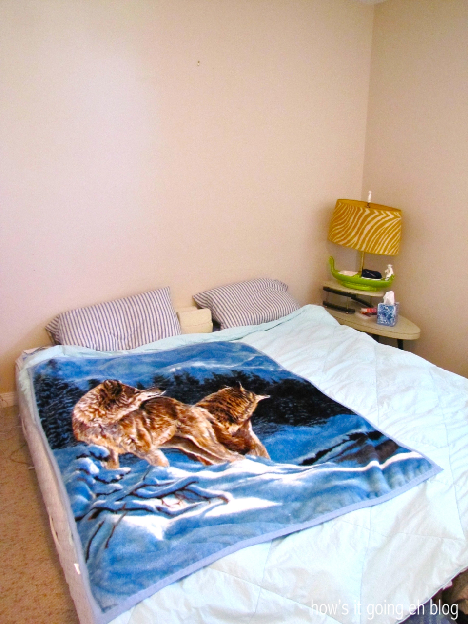 We are lucky that our friends Karen + Kyle let us borrow a king size mattress – or it would be Thermarests for us! It lays on the floor of our stark bedroom. My magic wolf blanket is a present from our buddies Steve + Liz. I use it because the comforter we brought is only a queen size + Jeff ends up hogging the whole thing. Thank you for sheltering me, wolf family!