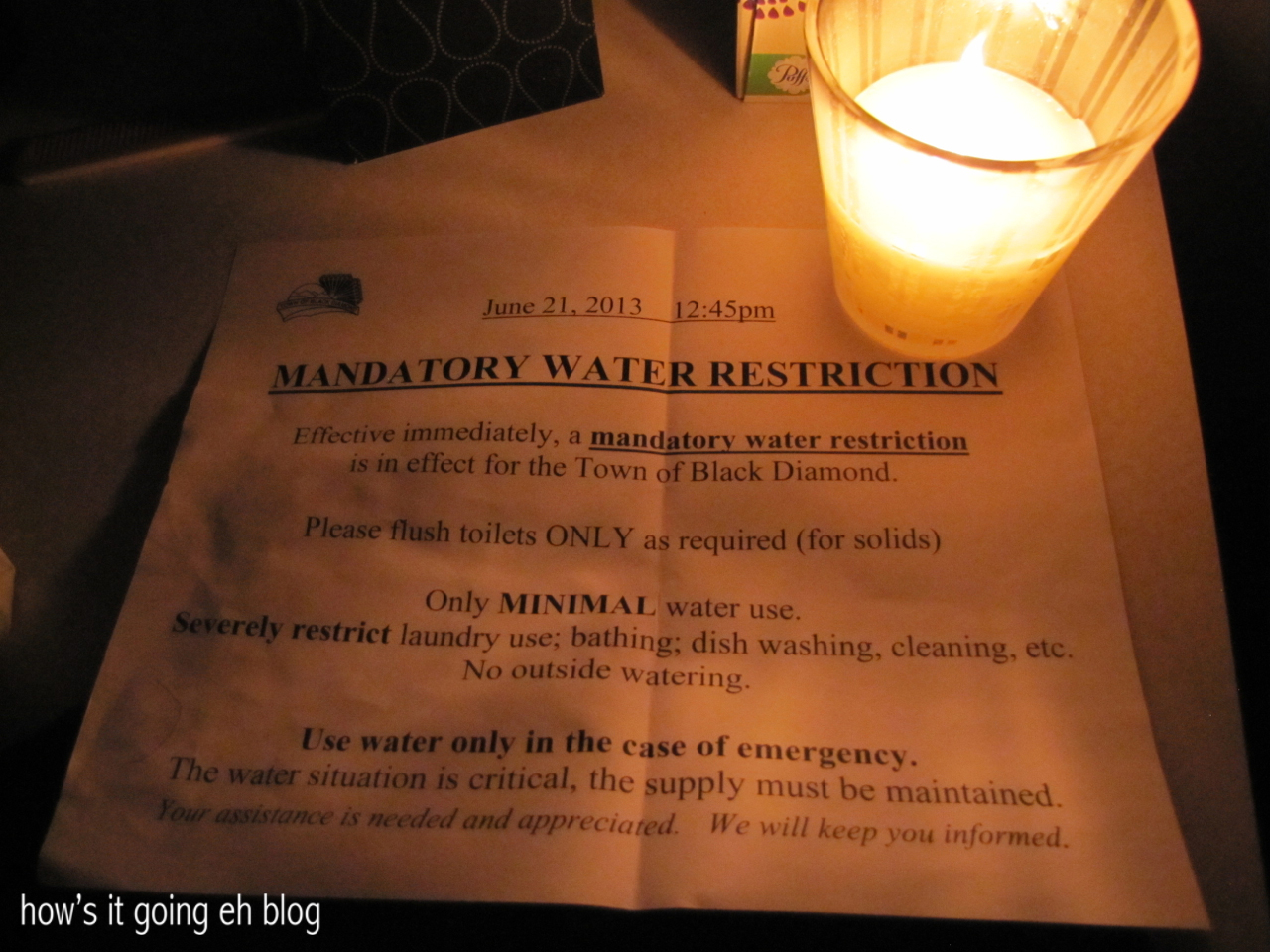 Devastation was ripping apart the communities of Southern Alberta as the flooding waters were unstoppable.  Jeff had gone to work that morning + the ministry ordered that production stop + all cast + crew evacuated.  Jeff had the hindsight to fill up the bathtub with water + ordered me to buy lots of bottled water.  Lo + behold, that afternoon a mandatory water restriction was placed, which is still in effect as of today.  Water Restriction