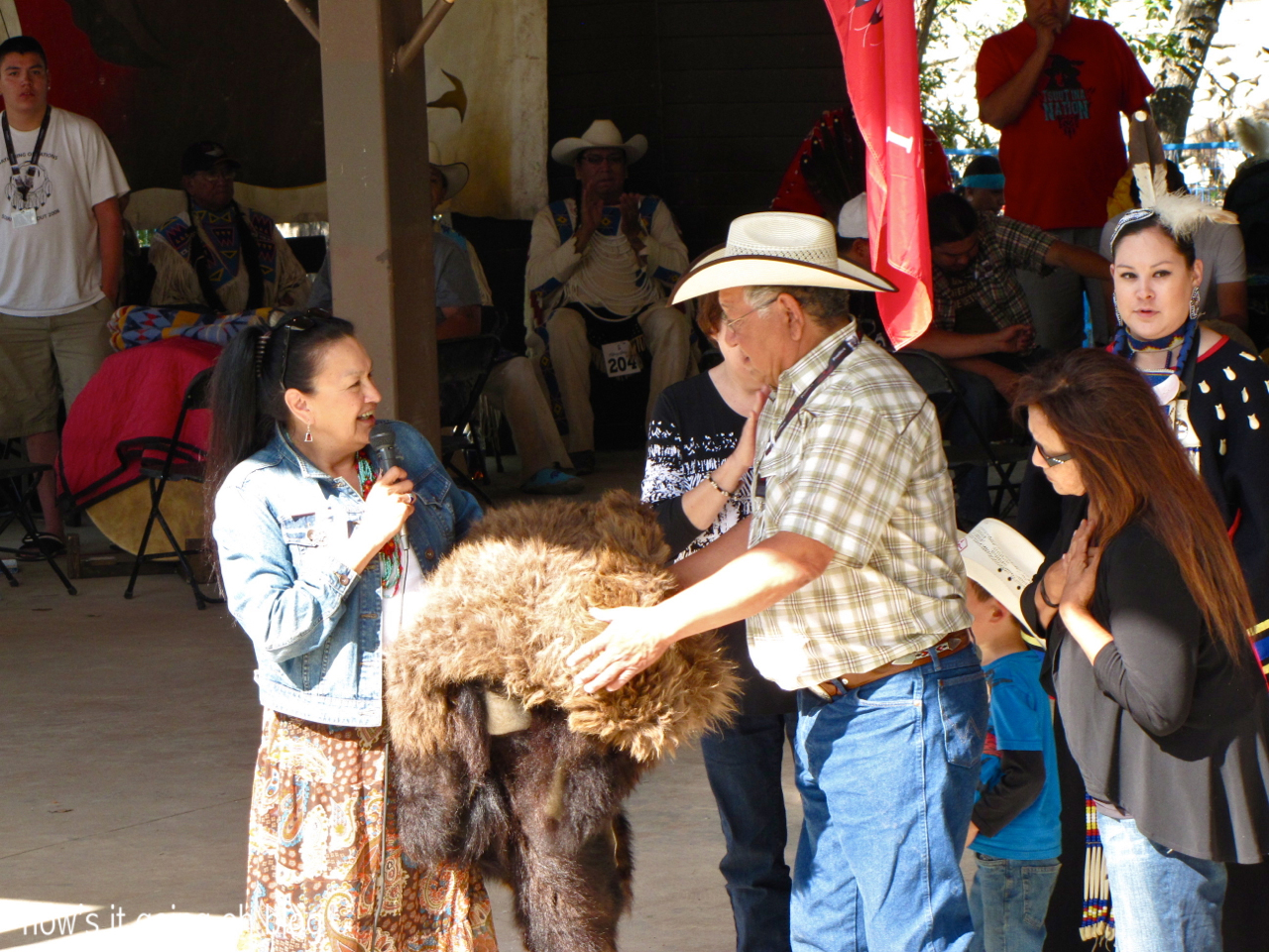 The MC at Indian Village’s house + all the contents inside had been severely damaged by the flooding + as a sign of support + love, the community presented him a buffalo hide. There was many a wet eye in the crowd.