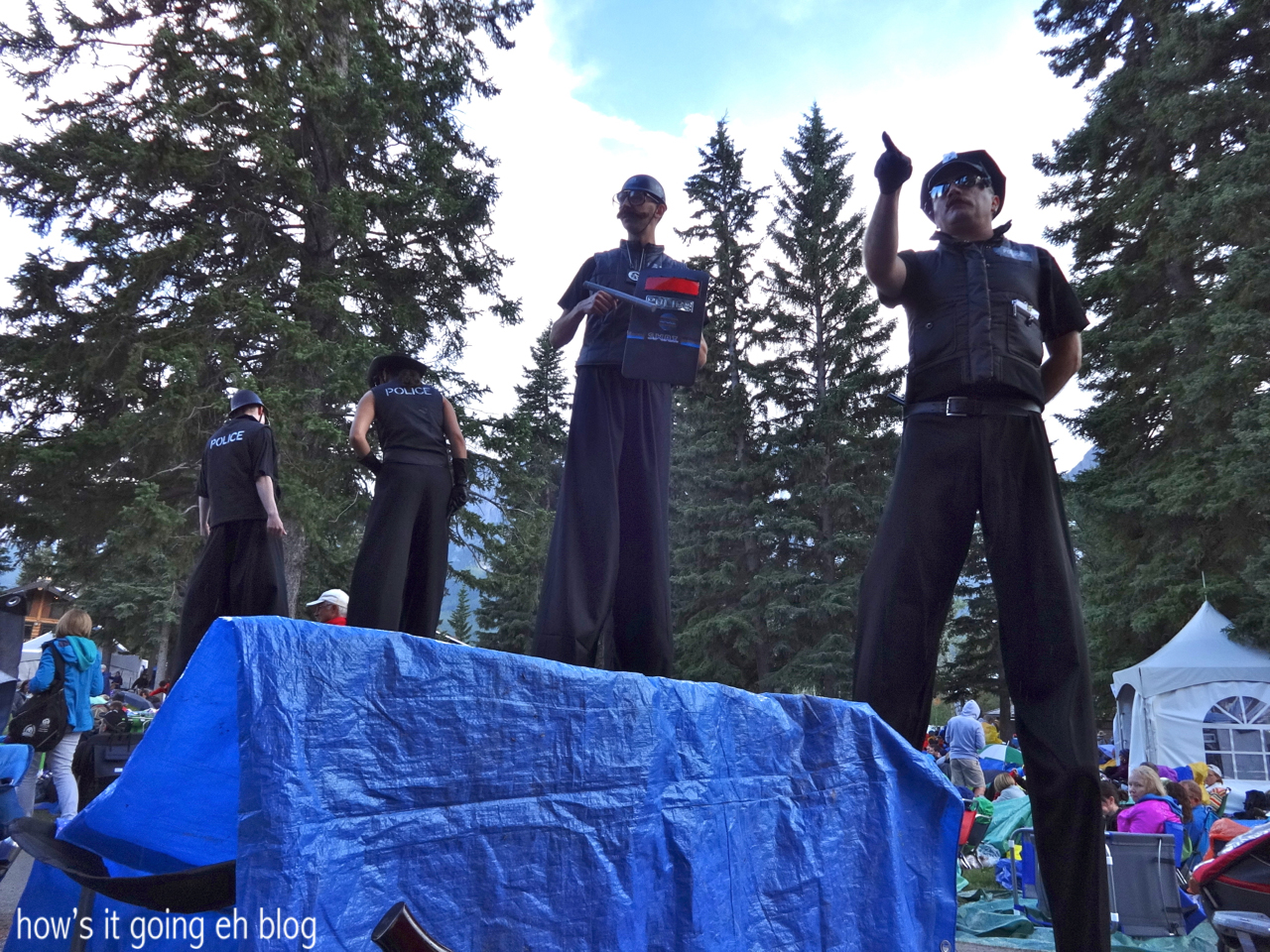 These police on stilts were hilarious, chiding the audience + writing up tickets!