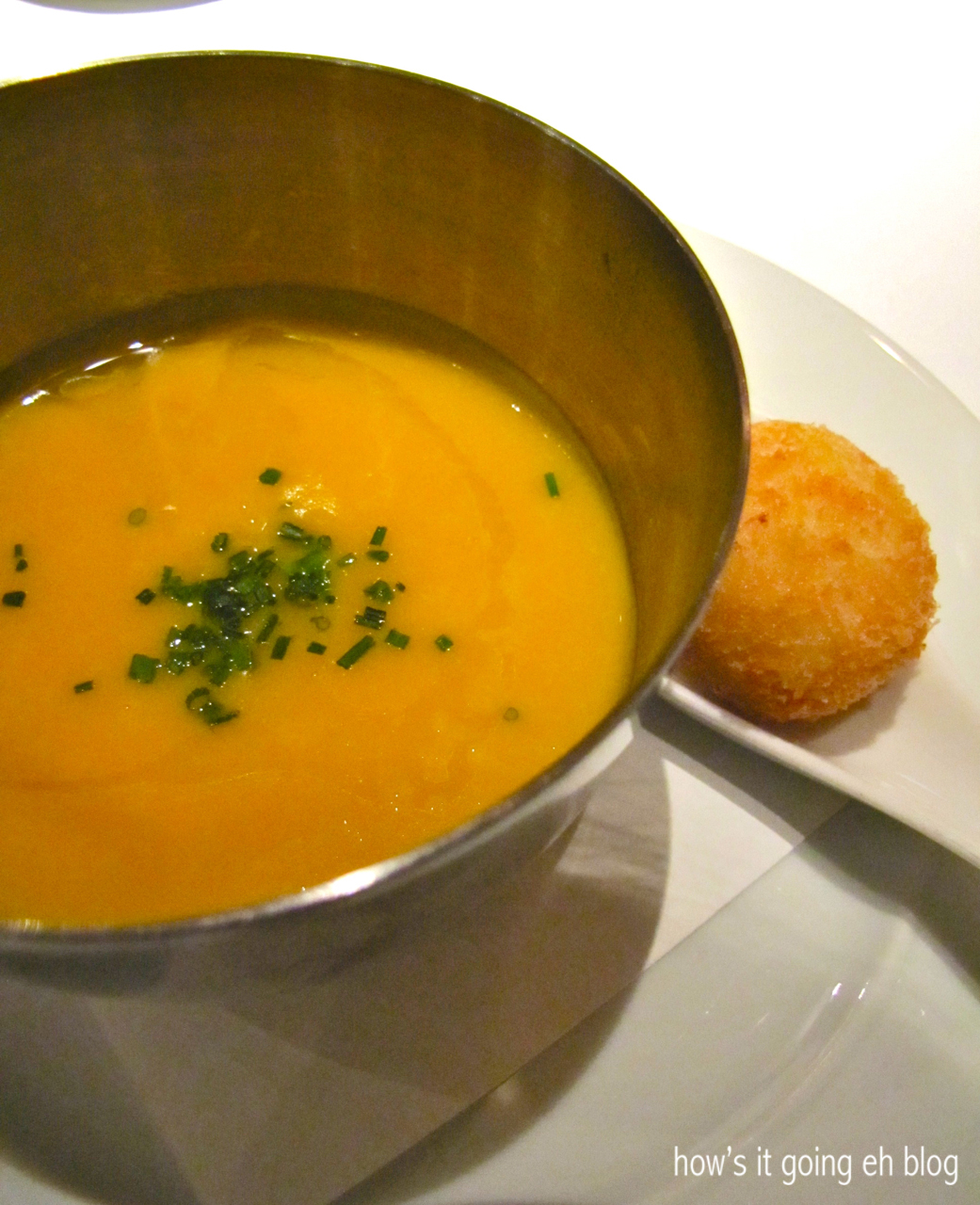 Butternut squash soup + arancini ball.Araxi