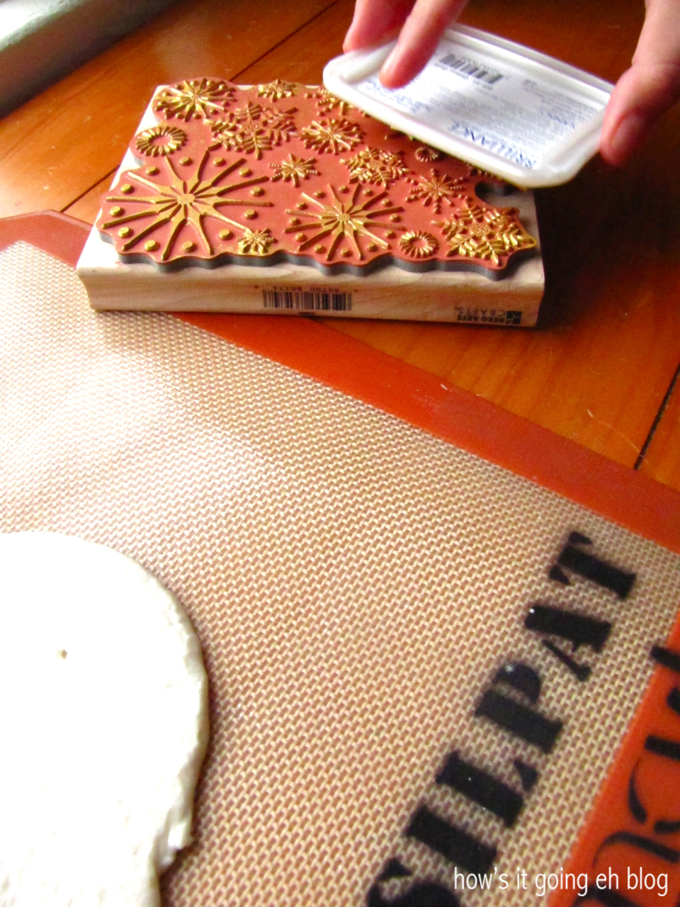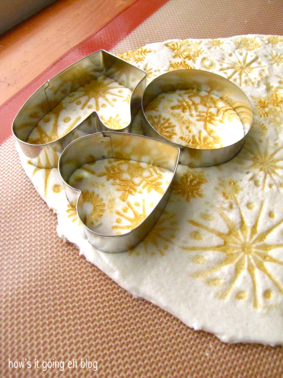 A perfect day for my holiday spirits. Last year when my sister was visiting we made salt dough stamped ornaments. Click here for the complete instructions. We rolled out the dough…