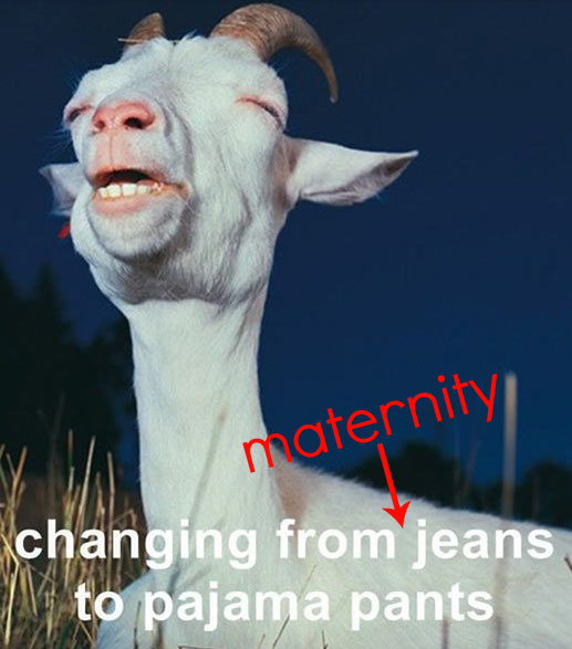 I didn’t buy a single “maternity” thing. I bought stuff that I would wear in a size up from my normal – things that could be worn easily after Peanut’s arrival. My mother is a seamstress and made two pairs of maternity pants for me (I’m so big they no longer fit), and my girlfriend gifted me a gently-used pair of maternity jeans that I wear up to this day.