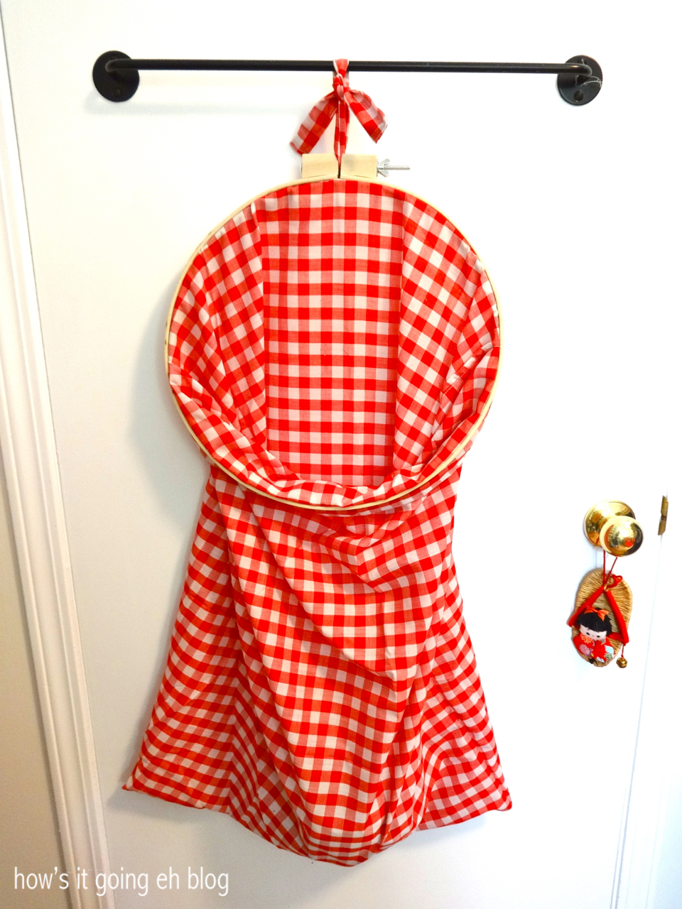 Look at the baby’s laundry hamper that my mom made!!! Inspired by Martha Stewart, of course. Laundry hampers are fugly + take up too much precious floor space. We used a sturdy, strong 12″ wooden embroidery hoop from Michael’s. Mom sewed up a rectangle about the size of a king size pillow case, double stitching it for durability + used the same fabric to create a loop to hang it with. No drawstring. Easy peasy! I love it!