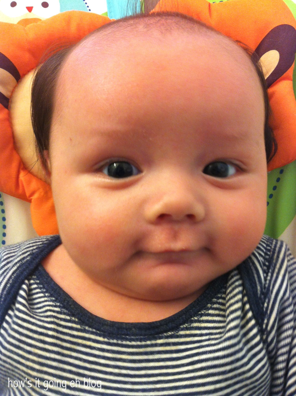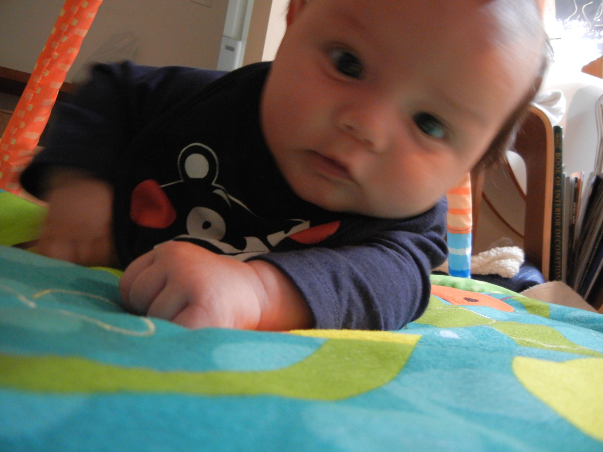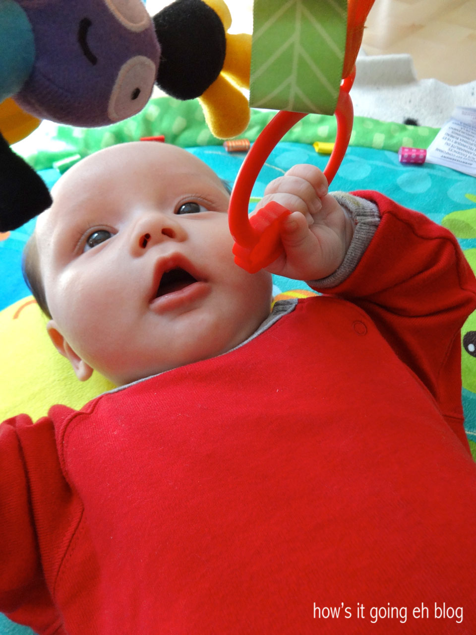 Developmentally, Langdon has been changing so rapidly! He is loving his activity center + is grabbing at things, fascinated with motion + color!