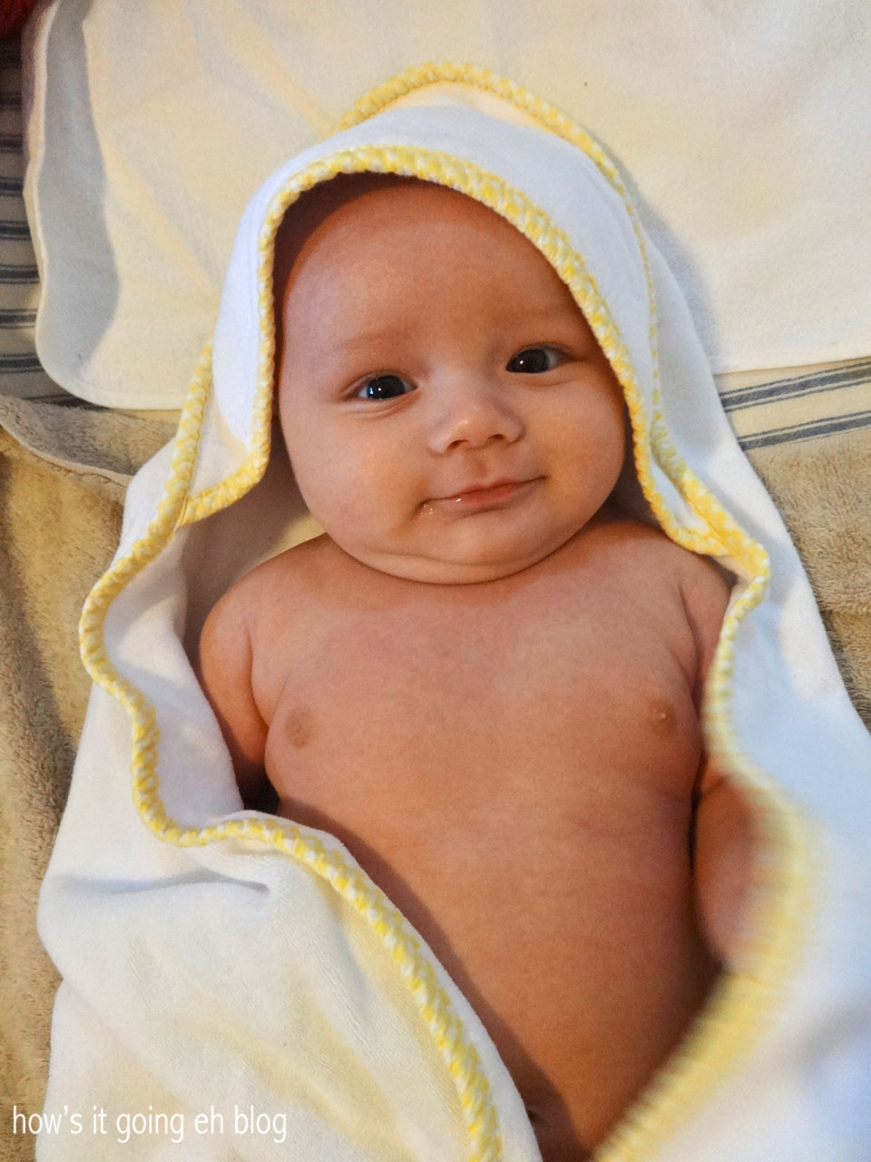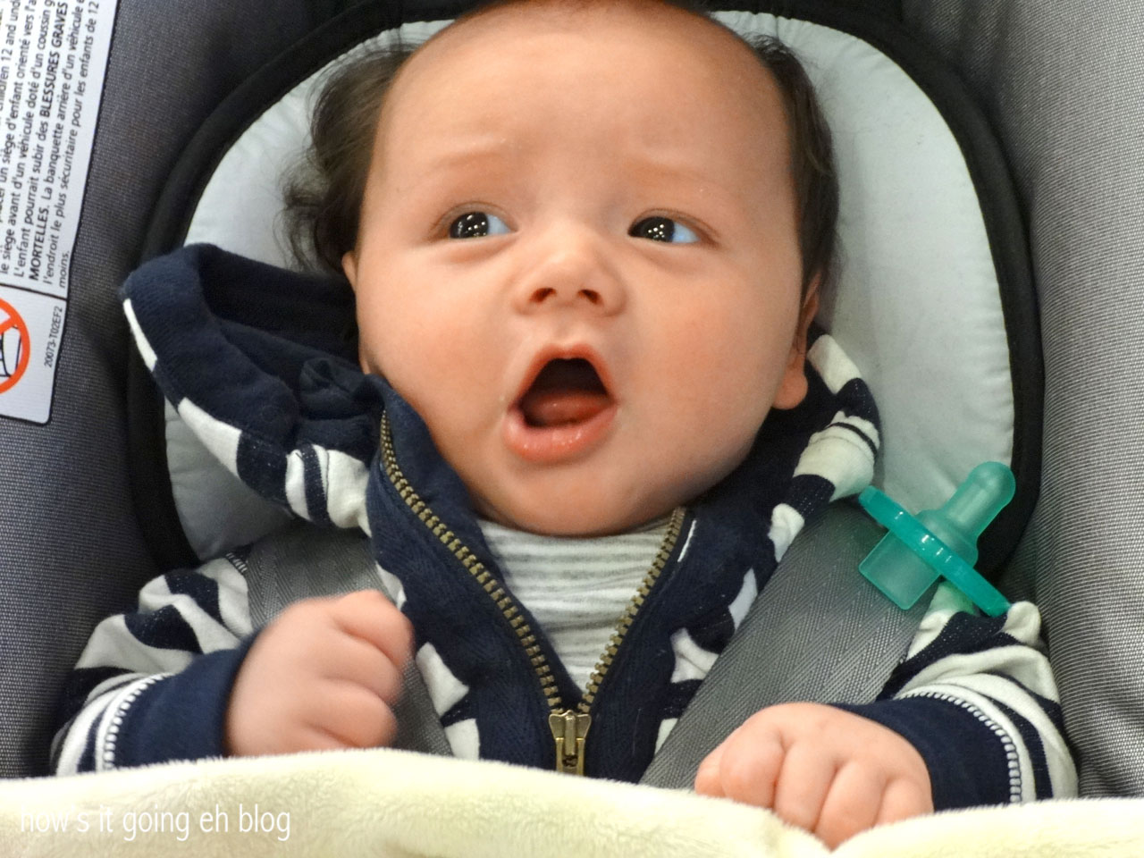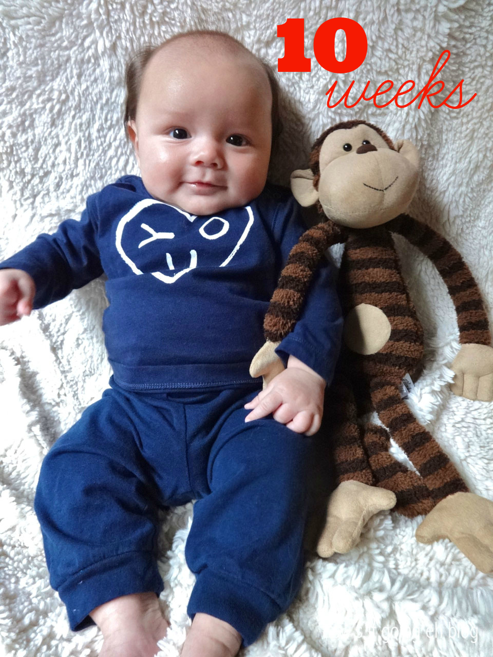 Developmentally, Langdon has been changing so rapidly! He is loving his activity center + is grabbing at things, fascinated with motion + color!
