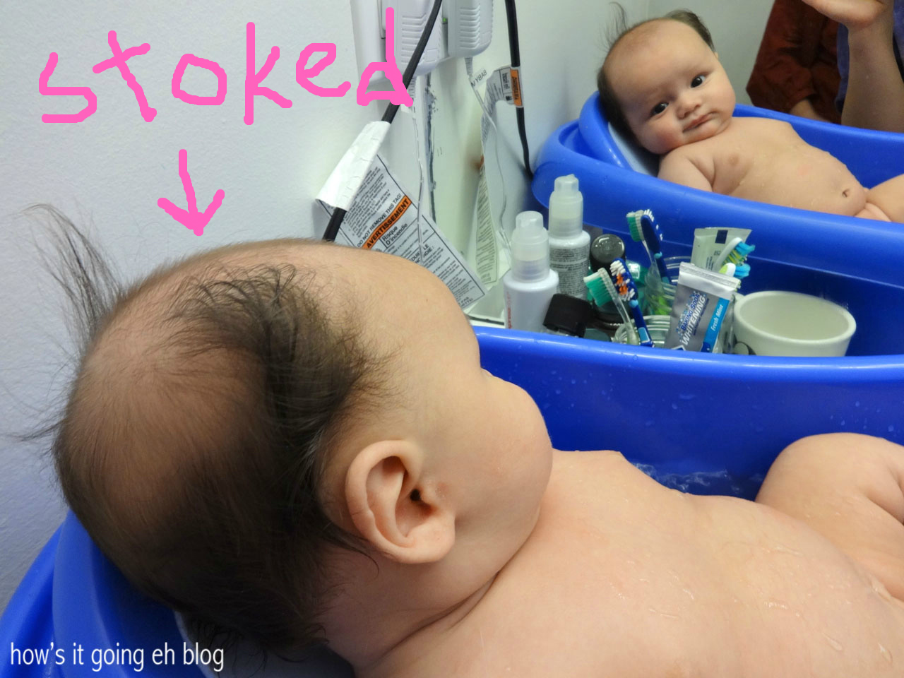 Mirrors have been entrancing him. This picture cracks me up of Langdon looking at himself during bath time with a very satisfied facial expression. He is going to hate me for posting this picture. Also, his classic hairline + Dr. Seuss cowlick in this pic are too adorbs. He has outgrown the bathroom sink + has graduated to his big boy bath!