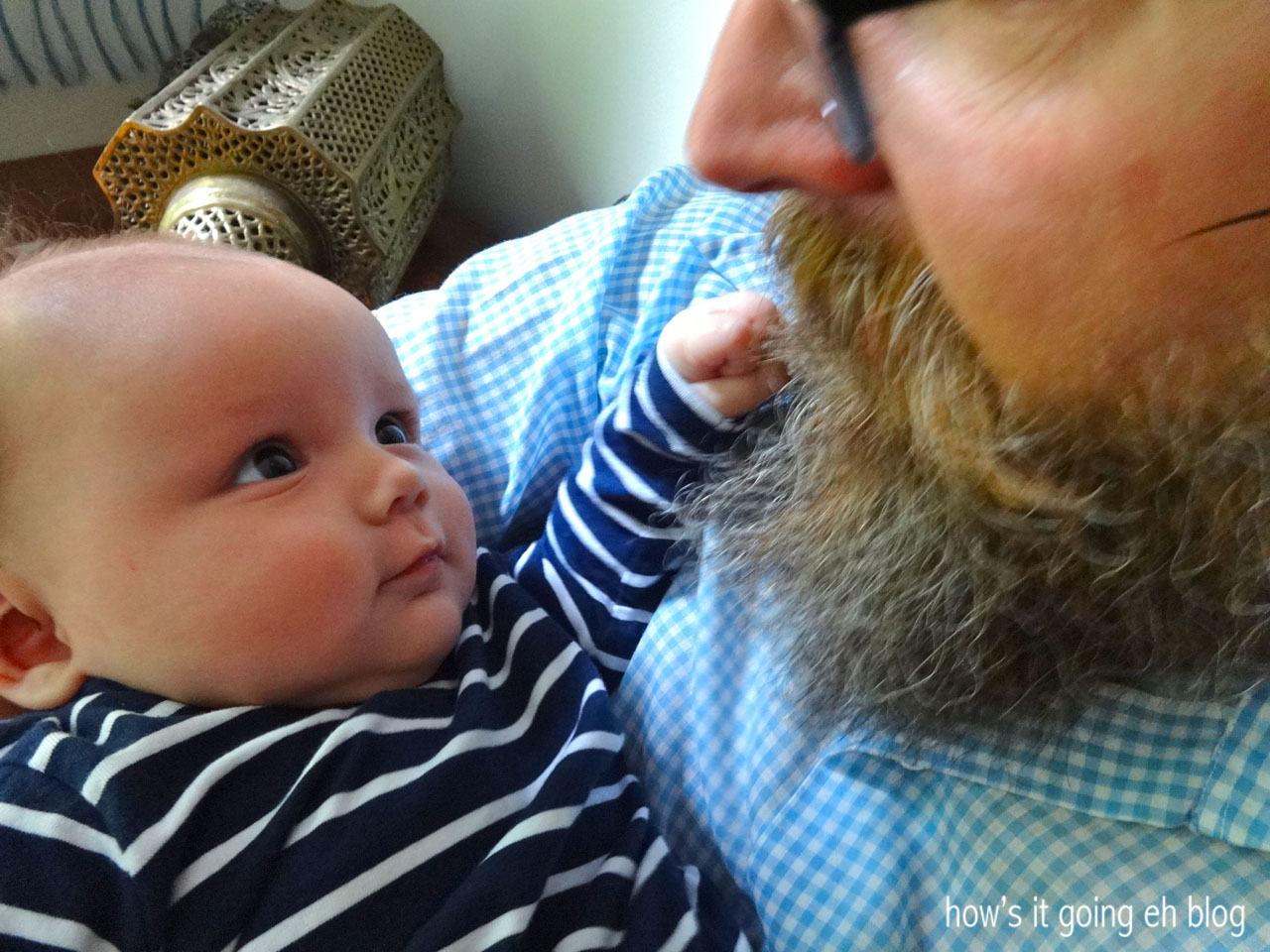 OOh so cute.  At first, Langdon was shy around his daddy.  Everyone wanted Jeff to shave his beard before he arrived, thinking the baby would be scared by it’s scratchy texture + frightening mountain man factor, but Langdon has proved them wrong!  He loves the beard!  That’s my boy!Blog - 04
