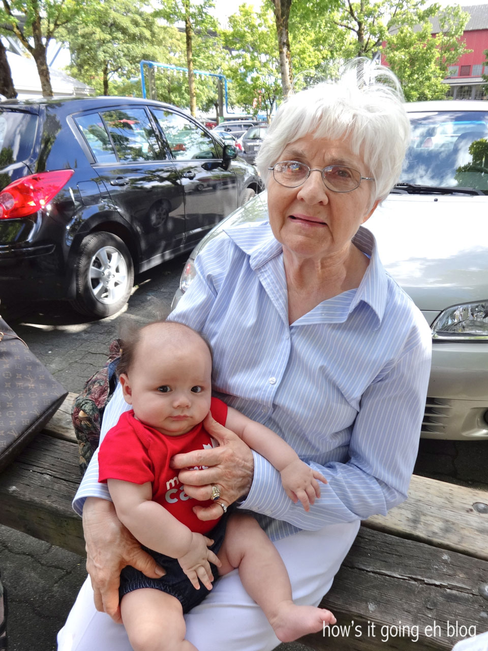We went to Granville Island for Canada Day – which was a mad zoo!!!  Jeff’s mum was visiting from Ontario to meet Langdon.  The two are chilling on a bench after some gelato.  Langdon has a sassy look on his face that makes him look like he’s advertising for men’s cologne.Blog - 12