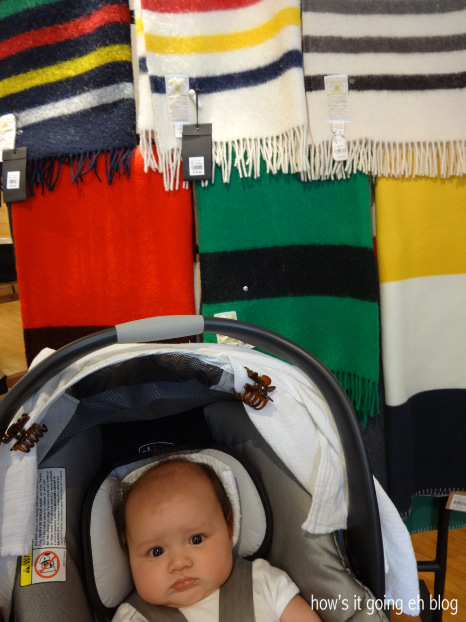 Since Langdon is half Canuck, I had to take a picture of him with Hudson’s Bay Blankets in the background. He was neither excited nor enthused. Especially with hair clips on his stroller.