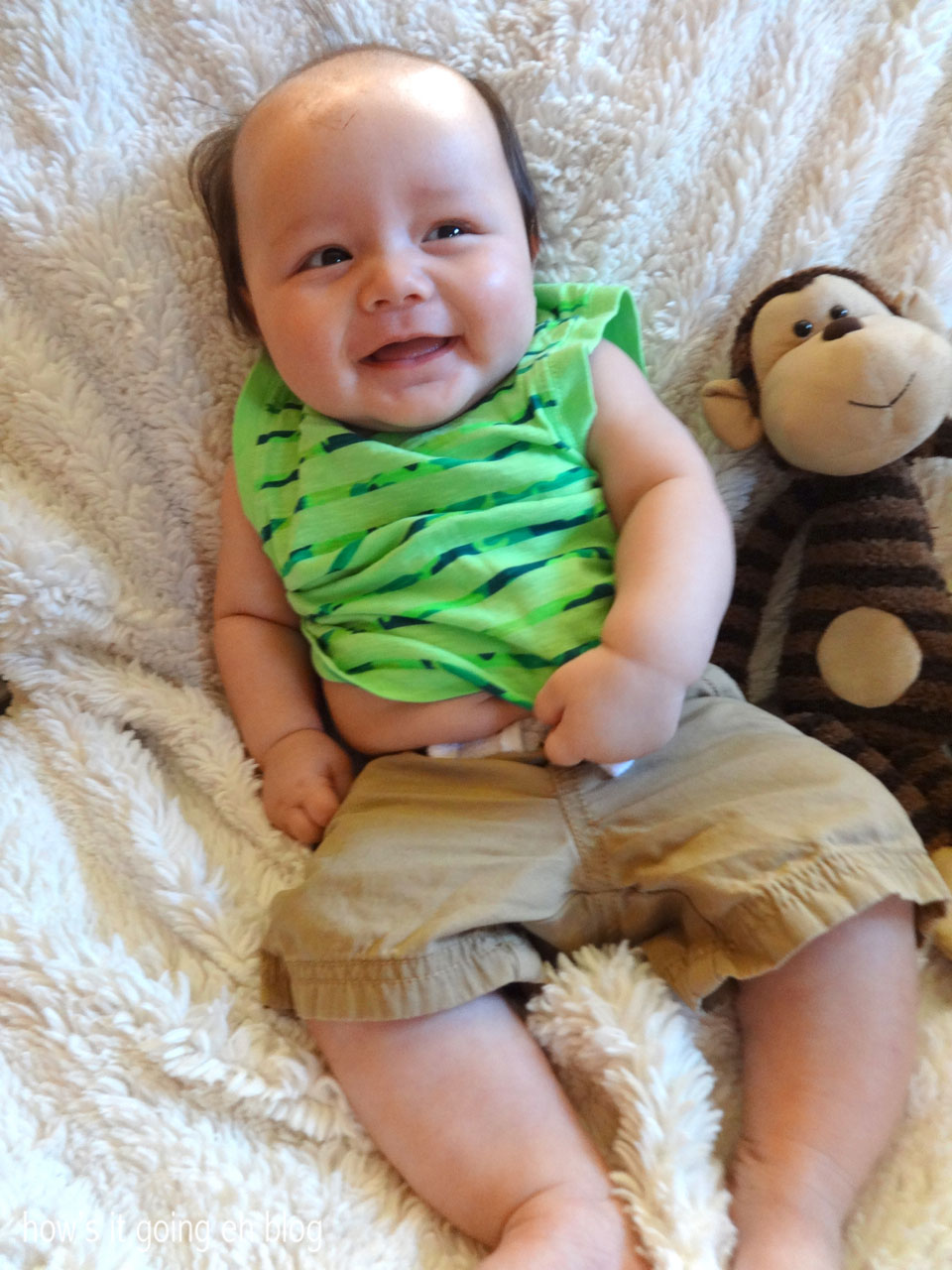 Right after that photo we changed him into this “bro” look. He looks like Grandpa Kenny in his tank top!!! Whatta belly – he was all kinds of flipping out with glee when we were taking this picture! A hot mess! A cute little hot mess!